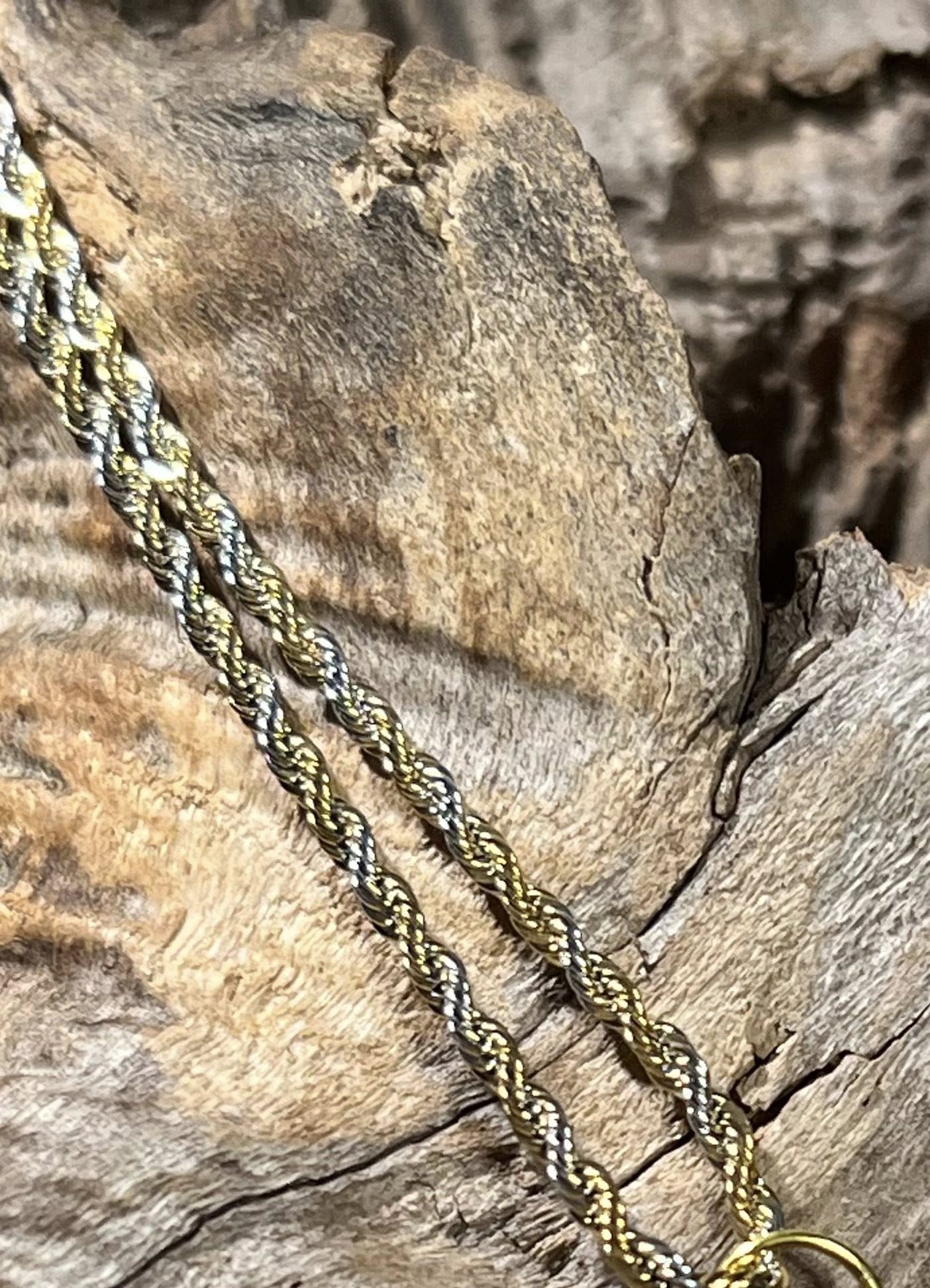 This stainless steel chain brings together two classic metals—silver and gold—woven in perfect harmony. The cool shine of silver meets the warm glow of gold, creating a striking contrast that catches the eye. Versatile and stylish, it can be worn casually or dressed up, making it the perfect complement to any look. More than just jewelry, it represents balance, unity, and sophistication—and pairs beautifully with either a silver or gold pendant.
